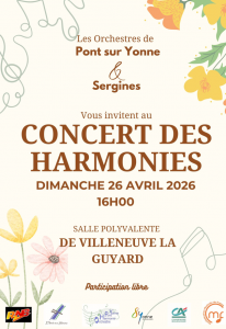 Concert des Harmonies, organisé conjointement par les orchestres de Pont-sur-Yonne et Sergines, le dimanche 26 avril 2026 à 16h, en la Salle Polyvalente de Villeneuve-la-Guyard. Participation libre.