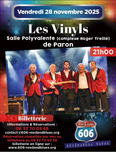 Vendredi 28 novembre a 21 heures, concert de blues avec le groupe les Vinyl’s salle polyvalente complexe Roger Treillé a Paron. Informations et réservations au 06 33 70 05 68 ou directement a Red Blues 606.