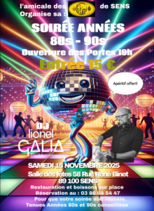 Samedi 15 novembre, l’amicale des chtimis de Sens organise a la salle des fêtes rue René Binet, une soirée années 80, 90. Ouverture des portes a 19 heures. Avec DJ Lionel Galia. Restauration et buvette sur place. Réservation au 03 86 64 54 47….. 03 86 64 54 47 . Tenue années 80/90 conseillée.