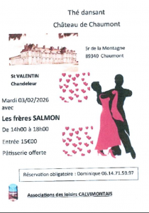 Thé dansant au château de Chaumont 5, rue de la montagne a l’occasion de la saint Valentin. Rendez vous mardi 3 février. Animation les frères Salmont de 14 a 18h. Entrée 15 euros avec une pâtisserie offerte. Réservation obligatoire au 06 14 71 59 97 .Organisation les loisirs Calvimontais.