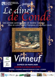 Samedi 28 mars a Vinneuf a 20h 30 salle des fêtes, la compagnie de théâtre amateur de Moret présente: la Diner de Condé. Une comédie contemporaine de Sandrine Campèse. Adultes 10 euros, enfants de moins de 12 ans 5 euros. Organisation le comité des fêtes.